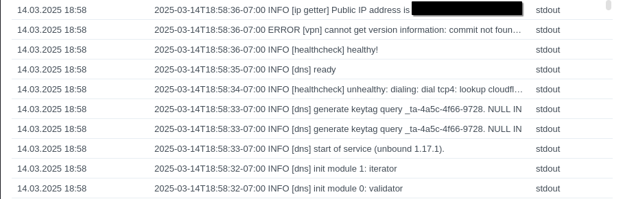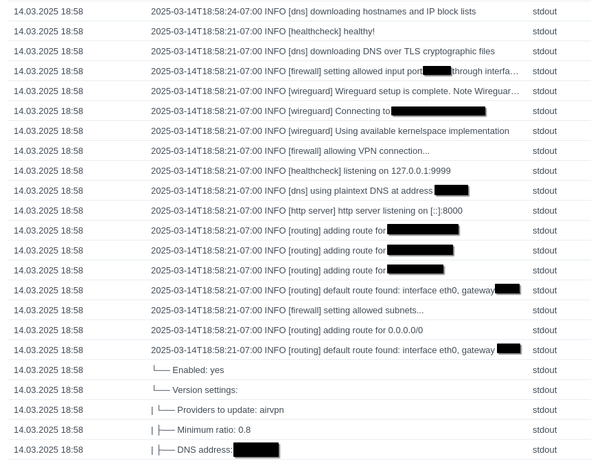 A good first step is to go into the gluetun container logs, in my case by using my synology gui but in your case likely dockge or some other portainer replacement. If gluetun is starting up properly, you should see something along the lines of this: